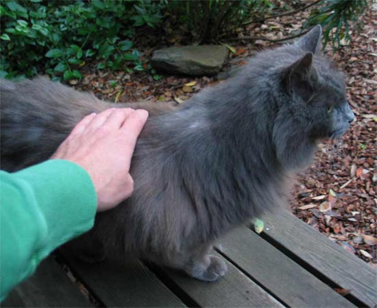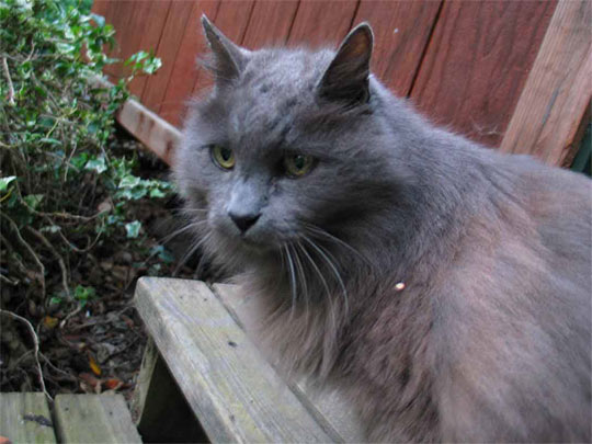 וזה הזמן לוידוי. פגשתי מישהו. מבוגר קצת, עם שיער מאפיר, עיניים ירוקות, עם קול נמוך וסקסי. תבינו, היה לי קשה כל כך רחוק מהבית. זה היה גדול ממני. אני מקווה ששמוליק ואלכס יוכלו יום אחד לסלוח לי. תכירו, זהו "אינשם", חתול האחוזה. קנינו לו מברשת, הברשתי אותו היטב והוצאתי את הטפילים שהתנחלו עליו, כשכל הזמן הזה הוא מגרגר בטירוף... והרי התוצאות: