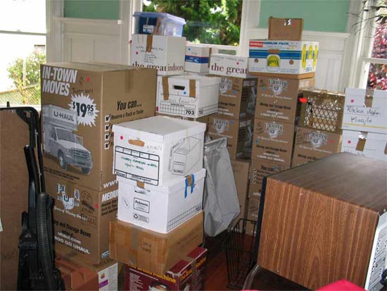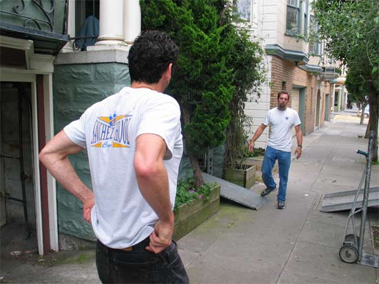 מה שכן, ההתארגנות בת המספר ימים למעבר היתה די טובה ורוב הזמן כשהמובילים העמיסו, יכולנו לרבוץ ליד המשאית ולצפות באחד מהמובילים. כששותפיו לעבודה היו בסביבה הוא רקק יריקות, כשזה היה רק הוא ומישהו מאיתנו בסביבה, הוא סיפר על המקומות שהוא אוהב ללכת לרקוד בהם בסן פרנסיסקו... אז הנה כמה תמונות מהדאווינים שלו, מהמרבץ שלנו ומההורדה המרשימה של פסנתר הכנף במדרגות.