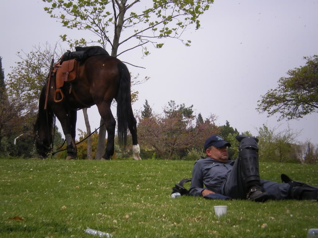 אל תתנו לאוירה הפסטורלית להטעות אתכם: עוד מעט השוטר הזה יעלה על הסוס שלו ויחבוט נמרצות בקהל מפגינים משולהב.