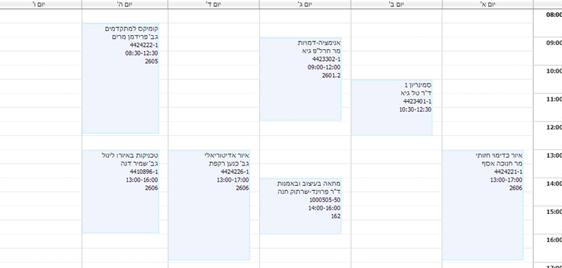 טוב אז סוף סוף הביאו מערכת לשנה הבאה והאמת שלא שינו כלום מהסקיצה היא נראית מרווחת אבל אני יודעת שזו רק אשליה וכל אחד מהקורסים האלה הוא קשה ויגזול ממני דם ויזע.