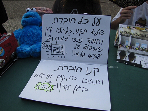 הדוכן אחרי שהצבנו את הפירסומת החדשה, לפני שהורדנו אותה כי היא זיעזעה והבריחה אנשים