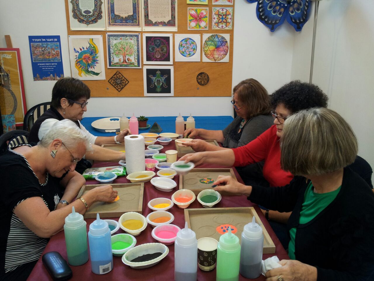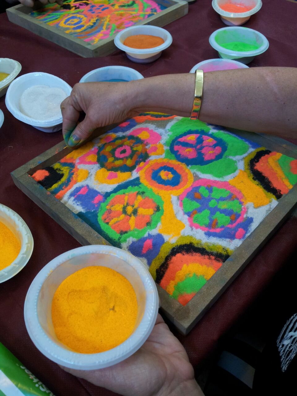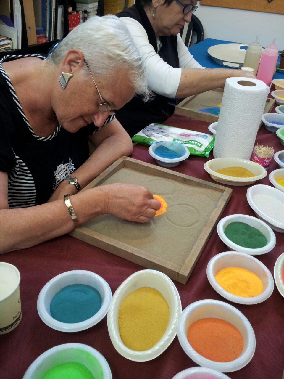 לפני בדיקה כזו אני בהחלט במתח, ושמחתי שמיד לאחריה יש לי שיעור ציור מנדלות...המשכתי היישר לשם מבסוטה מהתוצאות של הבדיקה. היום ציירנו מנדלה בחול. ישבנו ליד משטח חול נקי, שרטטנו באמצעות כוס חד פעמית את תבנית המנדלה, ופיזרנו באופן חופשי, באמצעות האצבעות שלנו, חול צבעוני.