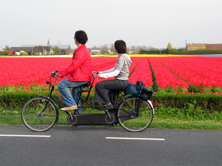 עכשיו היינו בשלים לגראנד פינאלה הגרנדיוזי - טיול אופניים בין שדות הפרחים שמחוץ לגן. נכון שנותרו שעה ומחצה עד לאוטובוס האחרון מהפארק, ונכון שמיס ווגל לא רוכבת על אופניים, אבל זה לא הפריע לנו לשכור שני זוגות אופניים לתיקולים ועוד זוג טאנדם (אופניים זוגיים) לווגלים, ולנצל את הזמן עד הרגע האחרון. היה מדאים! הרבה יותר שווה בעיני מהערוגות המסחריות שמסודרות כמו חיילים. ואפילו מיס ווגל דיוושה בהנאה ובחן בטאנדם מאחורי הפרעסר.