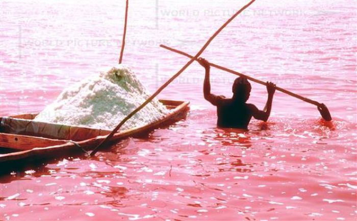 Lake Retba (או Lac Rose) נמצא בסניגל. הצבע הורוד שלו נגרם בגלל חידק בלתי מזיק שעושה פוטוסינטזה (החיידק בעל פגמנטים ורודים).