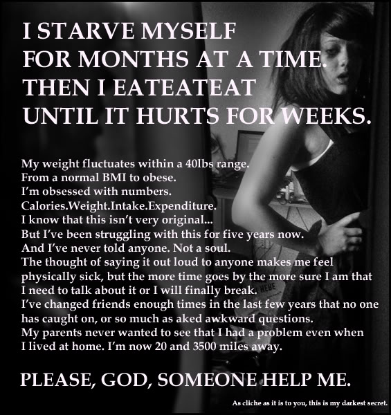 ואז ניכנסתי לאתר של ילדה אחת שאוכלת 22 קלוריות ביום, וזה הזכיר לי את הימים ההם.. ו שצמתי עד חודש ימים, והייתי יכולה לרשום לה משהו כמו :"כל הכבוד" כמו שהיא רשמה לי אבל על מה ?! היא מרעיבה את הגוף שלה למצב שהוא ניכנס לטראומה והוא אוגר שומנים, אז כאילו יקח לי פי 2 לעבד את המישקל שהיא רצתה.