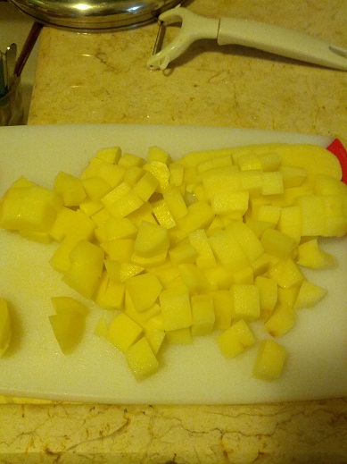 בנתיים מקלפים וחותכים 2-3 תפוחי אדמה לקוביות לא גדולות, כדי שיתרככו מהר אחר כך. מוסיפים את תפוחי האדמה לסיר עם הבצל והשום ונותנים להם לעשות קצת בטן גב.