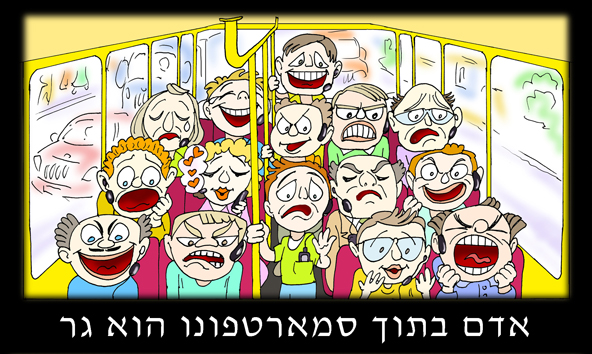 ציירתי התופעה הנפוצה שבאמצעי תחבורה ציבורית כשכל אחד שקוע במכשיר שלו, ציירתי בצורת ''מקהלה'' בה כל אחד שר ''אריה'' משלו.