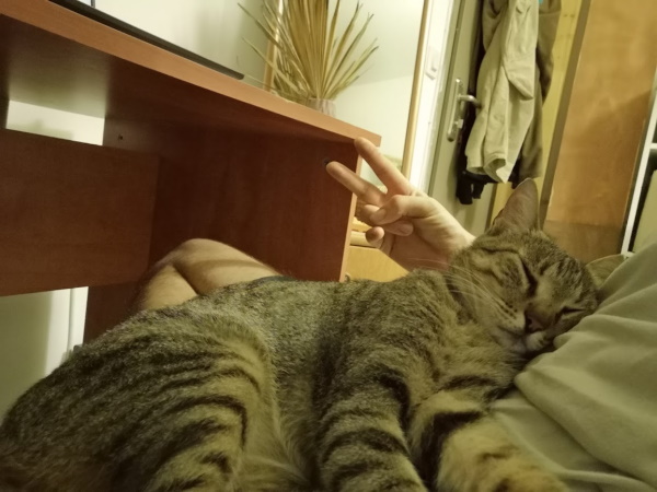 סיפרתי לאחי שאני רוצה לצאת לשטח ליומיים, והאם אני יכול לבוא כדיי לקחת פנס. הוא אמר שבוודאי, אבל הוא יוצא לחופש עם האישה אז אני יכול לבוא לשמור על החתולה שלהם במשך ארבעה ימים. אז שמתי קצוץ על התוכניות האישיות שלי כמו ששמתי לב שאנשים בודדים אוהבים לעשות.