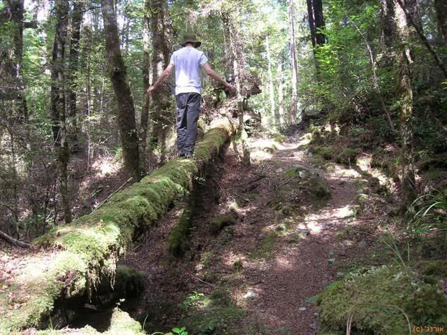 השביל התמזג עם The Lakeside track שהמשיך הרבה אחרי האגם. כשעברתי בערך חצי דרך הגעתי לשלט עם שני חצים. האחד- אפשר לחתוך שמאלה דרך עשבייה נמוכה ומעבר בתוך המים או שאפשר להמשיך עוד שעה וחצי עם The Lakeside track אל גשר חבלים. אתם בטח יודעים איפה אני עומד בקשר לגשרי חבלים (ואם לא, תקראו אחורה בסיפורי ניו זילנד). הרגשתי טוב, עמדתי בזמנים והחלטתי ללכת לראות את הגשר.