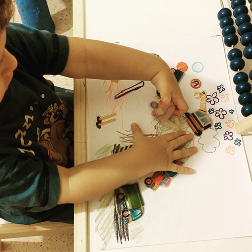 בתמונה: אחרי שקשקשנו ביחד על דף, סימה עומל להדביק מדבקות על הנוף שיצרנו. אחרי כל שתי מדבקות, ההיפר קם מהכסא, עושה סיבוב בחדר, מדליק את אחד הצעצועים המנגנים וחוזר לשבת איתי. קוצים בטוסיק קטן שלי.