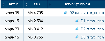 כאן יופיע לכם המידע על כל הקבצים שהעלתם לאתר, כולל מספר הורדות,גודל וכו'.