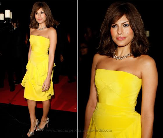 בשמלה מהממת של Bill Blass Spring 2009 היא משלימה את המראה בעזרת שרשרת ונעלי עקב כסופות של Louis Vuitton.