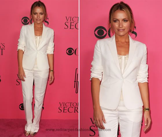 לשטיח הורוד היא הגיעה לבושה בחליפה לבנה של à la Don Johnson ונעליים ושעון בצבע זהב.