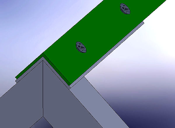 אני בחרתי בדרך עוד פחות טובה, חיבור בעזרת ברגי עץ. קדחתי בקורה העליונה (הירוקה באיור שלהלן) חורים בקוטר 5 מ"מ, בתחתונה - חורים בקוטר 4 מ"מ, ונעצתי את ברגי העץ (בקוטר 5 מ"מ) בעזרת מברגה. אם יש לכם מברגת אימפקט - זו פעולה קלה ופשוטה.