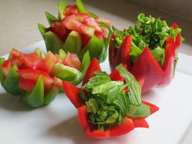 בעזרת סכין לעשות חתכים כמו משולשים כל פעם להפוך את הכיוון וזה יוצר 2 פרחים מפלפל אחד