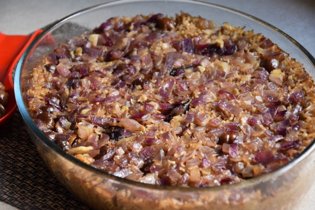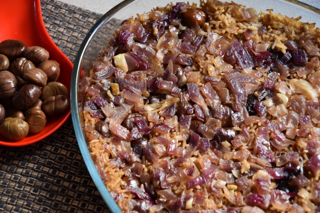 קדירת אורז ערמונים שזיפים יבשים ובצל סגול